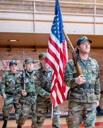 ELY HONOR GUARD members Dale Mikolich, Ted Bilben, Bruce Wheelright and Erik Johnson did the posting of the colors at the Veterans Day program in the gymnasium.