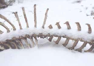 A very gnawed on rib cage, rough white sinews of fibers still cling, garish apart form the form of a live deer to be sure. Not a scrap of deer leather to be seen. A wolf ate there, another there. I wonder about the struggle. The chase, if any. Was it a sickly deer?
