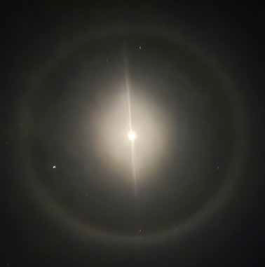 The phone buzzed on the dark night of Wednesday, Feb. 25. It brought a message from Andrew that resulted in a search from window to window and then out the front door to the deck to find the moon. Not a full moon or a new moon, but earth’s moon bordered by Jupiter, the bright star Capella and all surrounded by a “moon halo.”