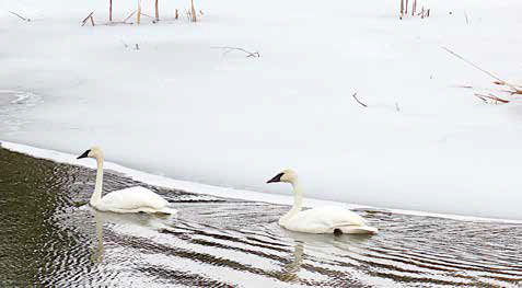 Then, from the landing, waterfowl were seen, identified, photographed, and discussed. Water temperature and other measurements were recorded. A pair of trumpeter swans (cob and pen) were watched feeding by stirring up water with their feet and then tipping with their heads under water and tails pointed up to feed. Hen and drake common goldeneyes were moving about, and pairs of Canada geese were resting on the shoreline ice.